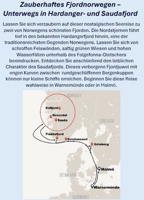 Warnemünde – Malmö – Flekkefjord – Bergen – Ålesund – Bessaker – Bodø – Tromsø – Honningsvåg – Kirkenes – Vardø – Hammerfest – Stokmarknes – Svolvær – Brønnøysund – Rørvik – Kristiansund – Bergen – Leirvik – Seetag – Warnemünde – Malmö